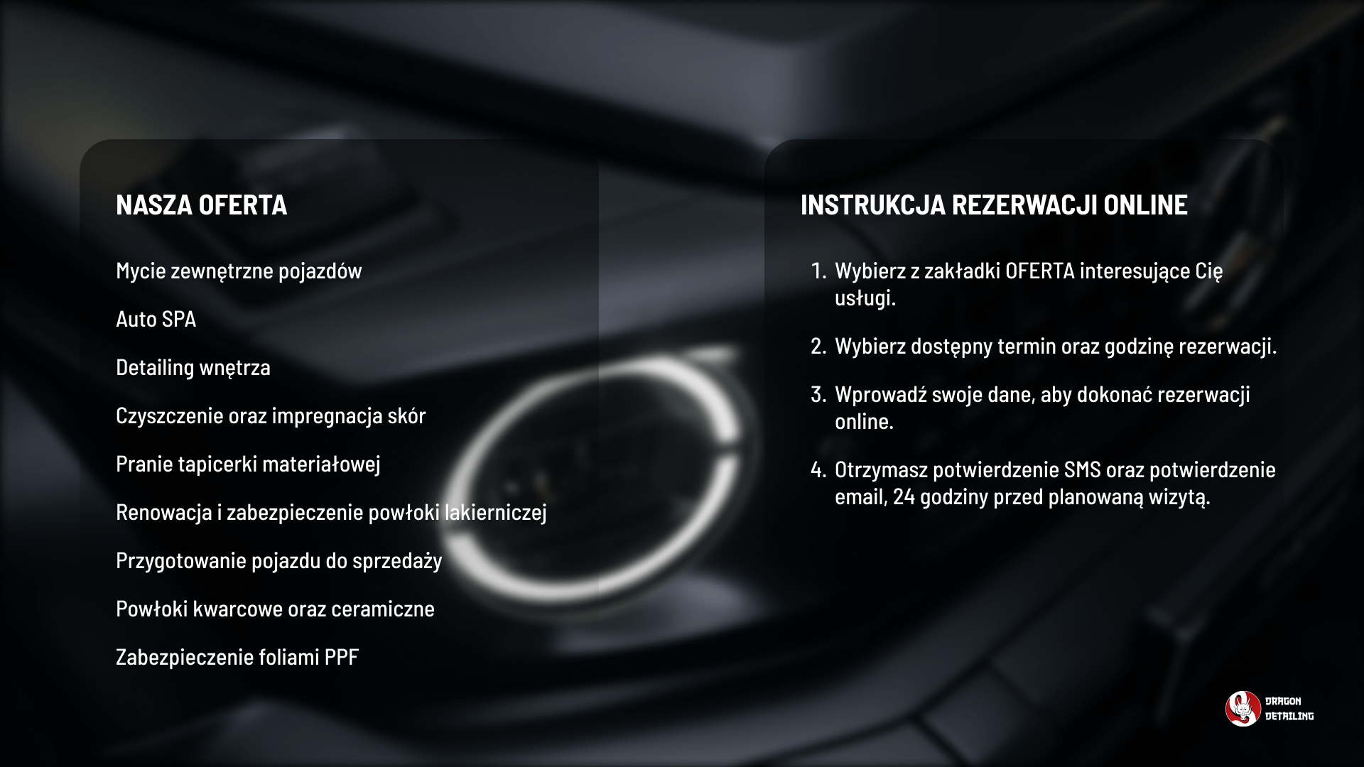 Dragon Detailing to miejsce, w którym motoryzacja jest naszą największą pasją. Oferujemy szeroki wachlarz usług, które świadczymy w najwyższym standardzie. W trosce o jakość ich poziomu, gwarantujemy bezpieczeństwo i zapewniamy pełne zadowolenie z wykonywanej przez nas pracy. Naszym atutem jest również profesjonalny sprzęt oraz wyposażenie, którym dysponujemy na co dzień.